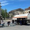 Він опублікував фотографії з центральної площі міста, де стоїть пожежна машина, до якої шлангом під'єднана труба на підпорках, з якої люди набирають воду.